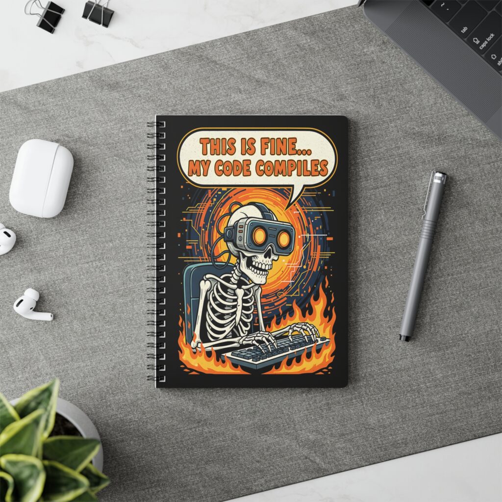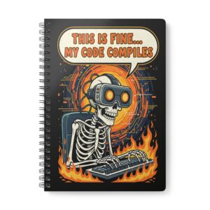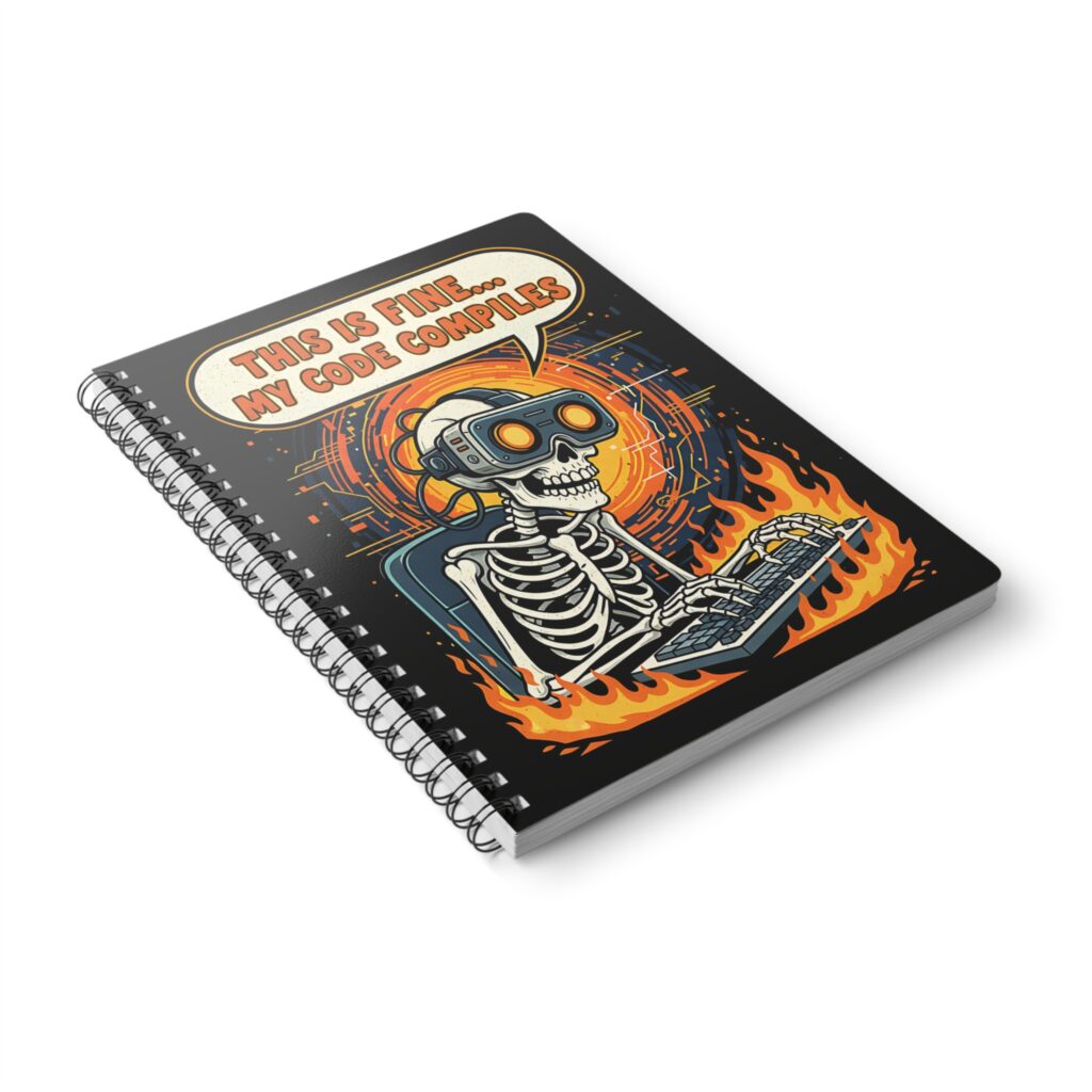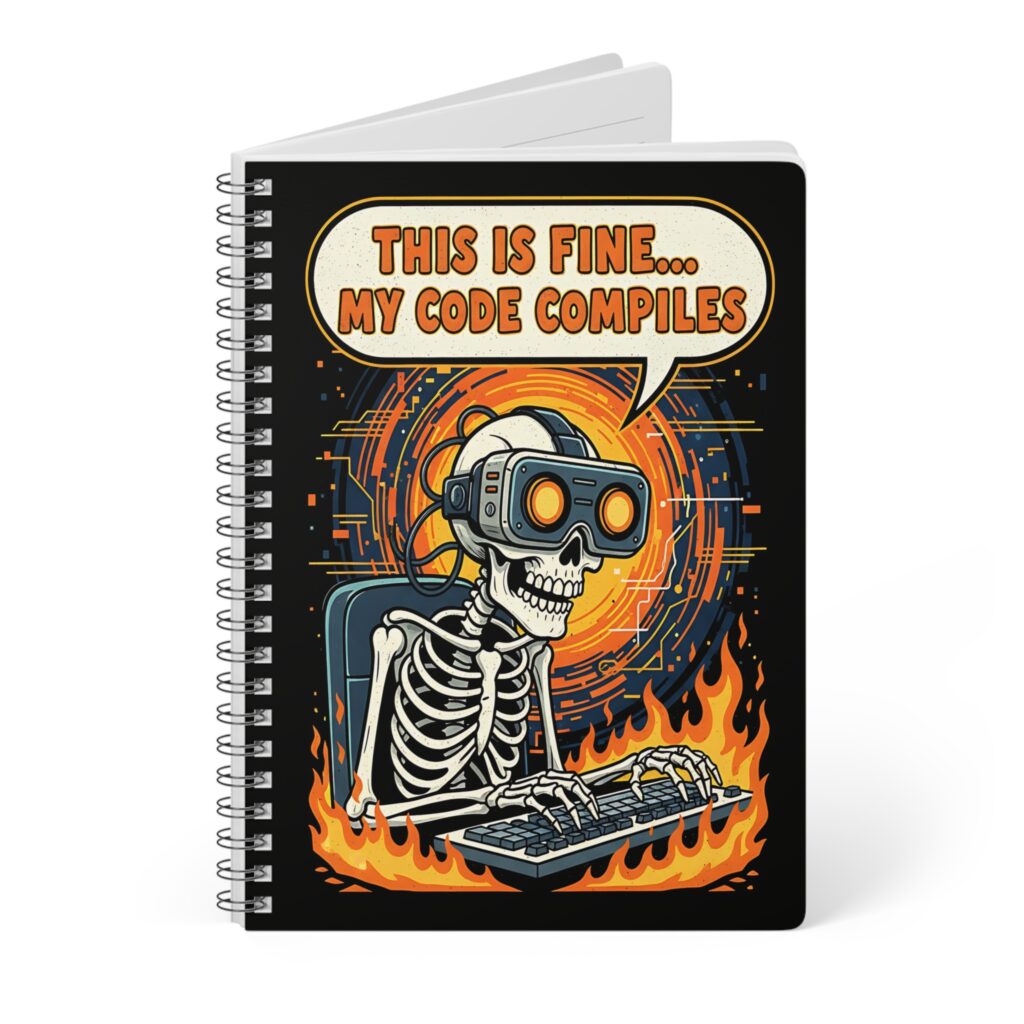 When the code’s on fire but at least your notes compile, this notebook has your back. Featuring RaigeMag’s signature skeleton programmer calmly typing through the flames, it’s the ultimate desk accessory for coders, gamers, and creatives who thrive in chaos.