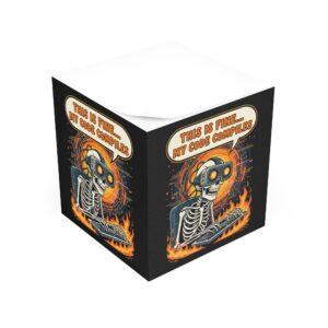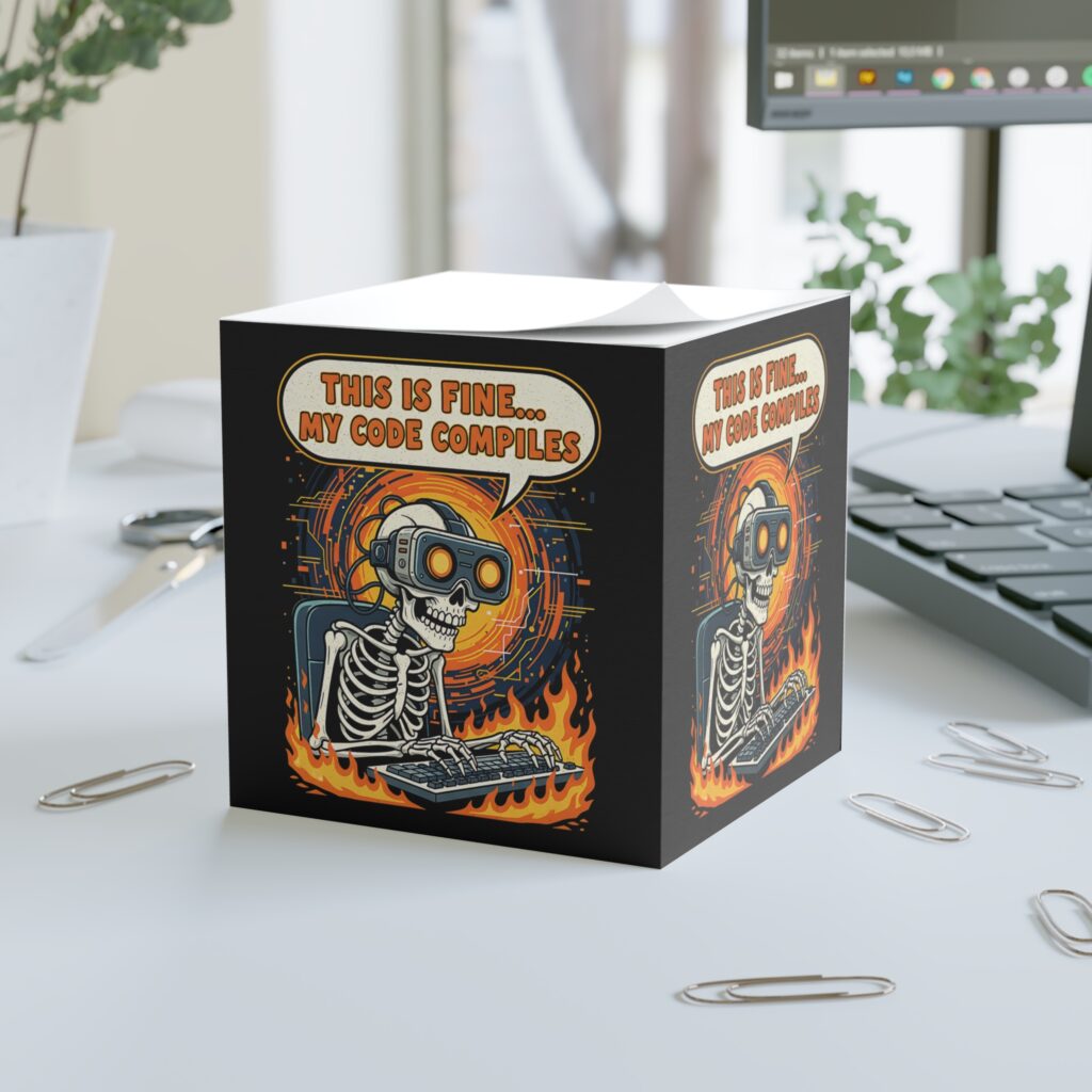 When the world is on fire but you still need to jot down a reminder, this note cube has your back. Featuring our iconic skeleton programmer calmly coding through the chaos, it’s equal parts funny and functional — the perfect desk accessory for coders, gamers, and students who thrive on caffeine, deadlines, and late-night debugging.